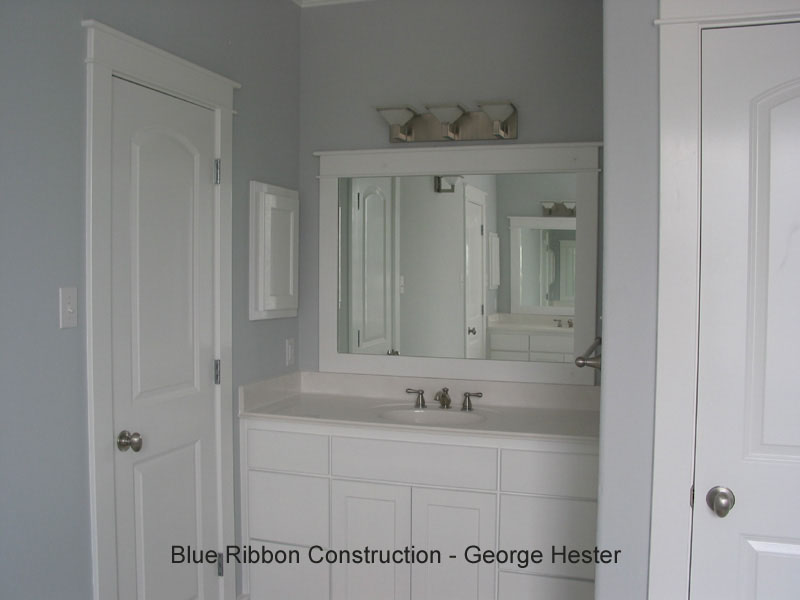 Master bath in home I designed with acrylic block window for light and privacy at soaker tub. Note there are no jets, as whirlpool tubs have nasty stuff growing in the water lines that you cannot get cleaned, hardly get used once the newness wears off, and always end up broken. This is the "Hers" side with separate vanity, medicine cabinet, and large walk-in closet. |