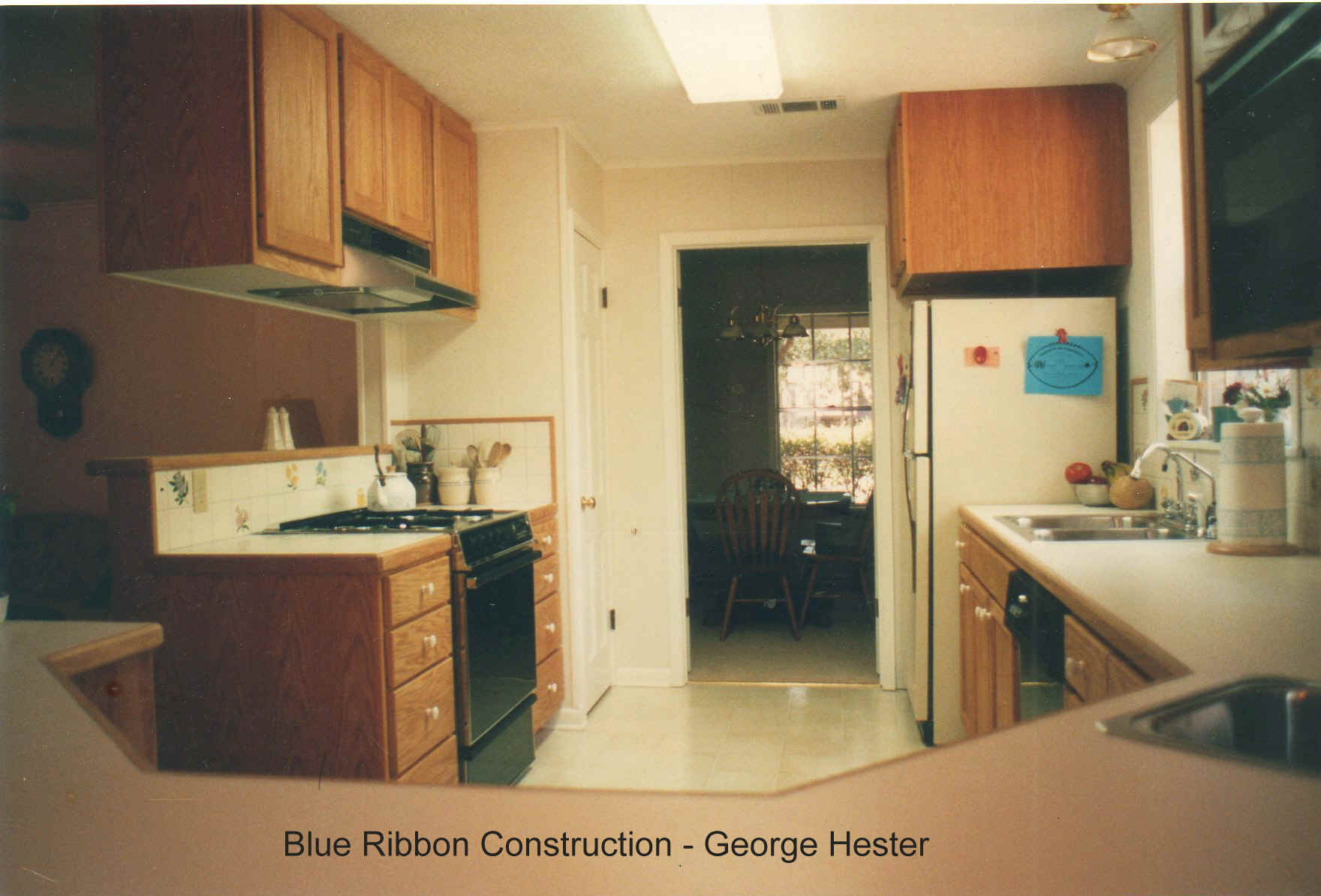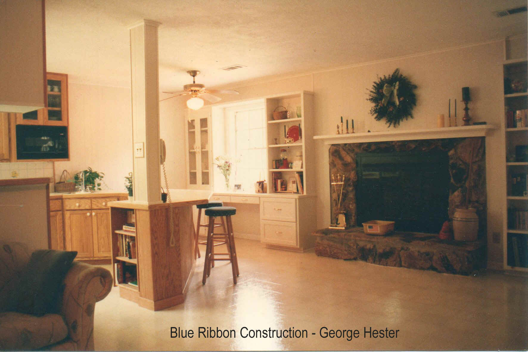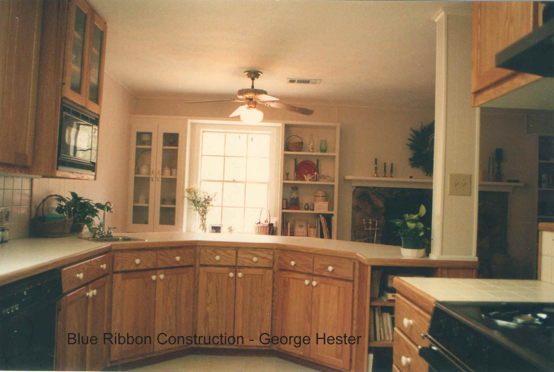 A cedar 4x12 mantle was replaced with this simpler, yet trimmed out unit. The painted desk area was added, and all the stained paneling was painted to brighten the space. The stained oak kitchen replaced the 70's vintage galley kitchen. Two walls were removed to allow for interaction between the kitchen and the family room. As nice as this turned out, I got the highest praise from the mother of three small boys for moving the laundry room upstairs where the boys' rooms were. It took a lot of convincing on my part, but when it was all done, she was very happy with the results. |
